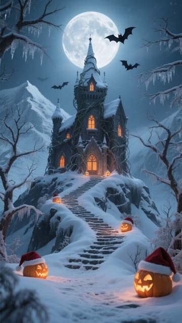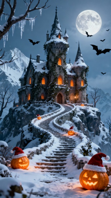 一座被藤蔓缠绕的古老哥特式城堡坐落在冬日雪山之巅,城堡尖顶上覆盖着厚厚的积雪,窗户透出温暖的橘黄色光芒,城堡前方是一条被白雪覆盖的蜿蜒石阶小路,小路两旁点缀着几个戴着圣诞帽的发光南瓜灯,天空中挂着一轮皎洁的满月,几只黑色蝙蝠在月光下飞舞,周围是光秃秃的、挂满冰凌的枯树枝,整个场景笼罩在一种神秘而温馨的冬日氛围中,3D渲染,超详细,高清,8K分辨率。