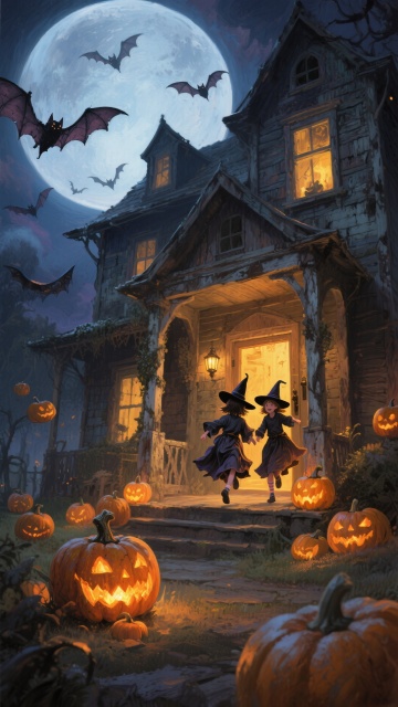 哥特风格老屋前,两个小女巫手牵手奔出,南瓜灯与满月交织出梦幻神秘的万圣夜,插画风厚涂手法营造温暖光影,故事感十足。