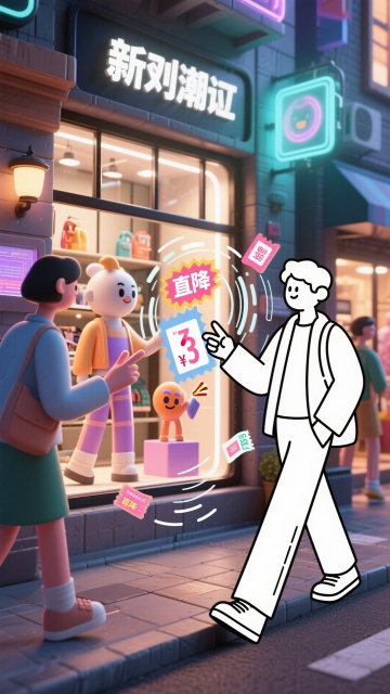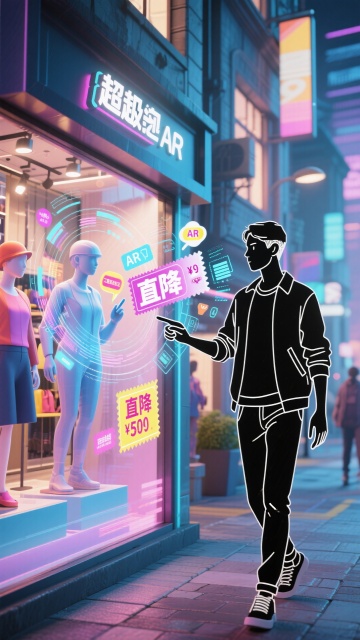 近景,虚实交织街道,消费者佩戴AR眼镜,现实身影清晰,周围线条虚化。橱窗被AR点亮,立体3D商品模型闪烁“直降”价格,互动优惠券环绕。特写消费者指尖触碰橱窗瞬间,数据涟漪扩散,强调光影对比,营造未来感氛围