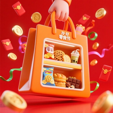 3D重拟物风格火箭载满零食飞向天空,融合波普艺术色彩与塑料质感,粒子光效营造未来科技感,双11促销主题鲜明,视觉冲击力十足。