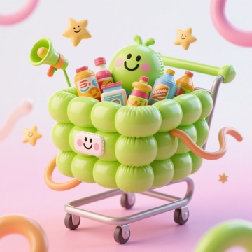 3D风购物车,拟人化商品,塑料质感,可爱卡通风格,节日促销氛围。