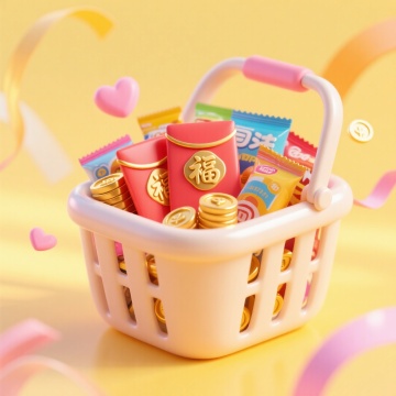 软3D风格购物车,充气质感搭配彩色购物袋与金币,波普艺术色彩碰撞,营造可爱卡通喜庆氛围。