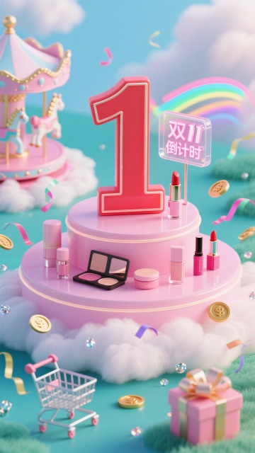 软3D风甜品微缩场景,粉嫩色调营造甜美梦幻氛围,粘土质感搭配粒子光效,趣味十足的促销元素点缀其间,传递双11购物狂欢的可爱与浪漫。