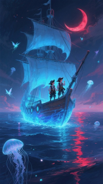 梦幻感与神秘感交织的夜海奇航,光影流动中浮现幽蓝鬼船,水彩风渲染的虚拟自然,粒子风点缀荧光水母,插画风与动漫风融合,超现实主义叙事,万圣节故事感十足。