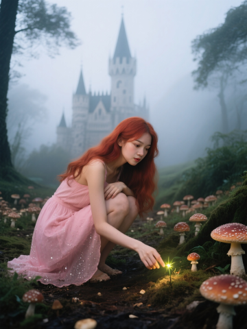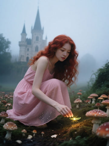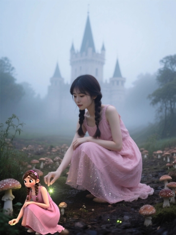 粉裙公主蹲在蘑菇林,指尖轻触发光萤火虫,裙摆沾着晨露,身后城堡尖顶穿透迷雾