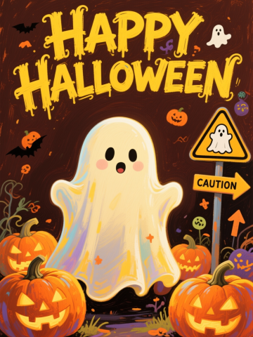 扁平风卡通南瓜戴巫师帽,拟人化设计搭配蝙蝠与魔法瓶,剪纸感元素营造喜庆趣味的万圣节氛围。