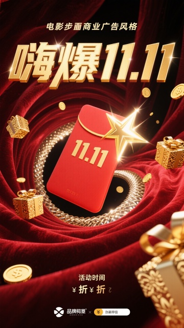 鎏金3D字体搭配旋转红幕背景,重拟物红包悬浮其中,光影流动强化体积感,酷炫喜庆引爆双11促销氛围。