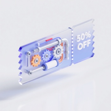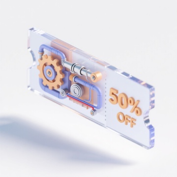 透明玻璃风3D票券,融合齿轮与管道的轻拟物设计,科技感十足,展现未来感清透美学,传递50%折扣优惠信息。