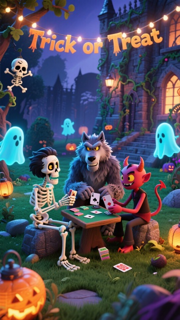 古堡庭院,3个角色,骷髅、狼人、小恶魔在草坪上玩斗地主。周围有飘荡的幽灵灯笼和爬满藤蔓的骷髅装饰,上方灯串挂着文字“Trick or Treat”,背景是阴森又古老的城堡,整体风格神秘又充满童趣