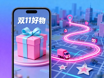 软蓝色和紫色渐变背景,左边是一部逼真的智能手机,屏幕上显示一个打开粉红色的礼盒,上面装饰着一条光滑的浅蓝色大丝带和蝴蝶结,还有中文文字“双11好物”用白色,俏皮的字体。在右边,描绘了一条发光的粉红色霓虹灯路径(类似于一条蜿蜒的道路或丝带),它在一幅程式化的城市地图上蜿蜒曲折(带有模糊的建筑轮廓和城市细节)。沿着这条路,包括可爱的图标:一辆粉红色的送货卡车,小产品符号,和底部的星形贴纸。整体风格充满活力,梦幻和节日,融合数字和插图元素,传达礼物或快乐旅程的主题。
