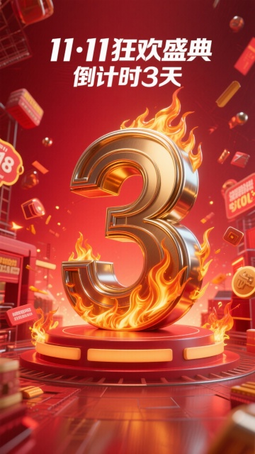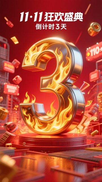3D鎏金火焰数字“3”矗立于红色舞台,金属质感与粒子光效交织,营造出喜庆、热血、冲击十足的双十一倒计时氛围。
