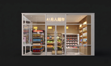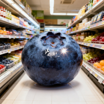 巨型蓝莓置于超市通道中央,金属质感与3D重拟物风结合,光影折射营造虚拟现实冲击感,体积感十足,突显节日视觉奇观。