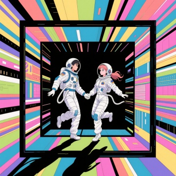 未来感十足的动漫风设计,宇航员在霓虹灯闪烁的虚拟现实中漫步,科技与梦幻交织。