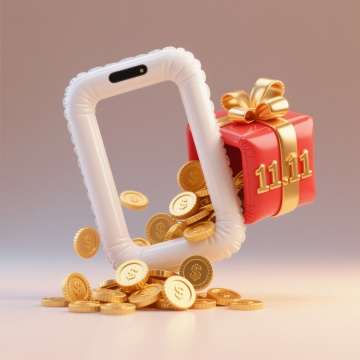 充气风手机框与鎏金礼盒碰撞,金币倾泻而出,融合3D重拟物设计,传递双11喜庆促销与科技感。