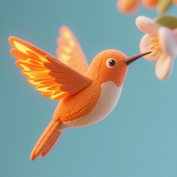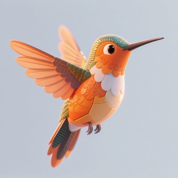 软3D风卡通蜂鸟,可爱大眼,橙白相间,轻盈飞翔,背景清新。