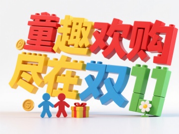 "双11 尽享童趣",乐高积木字体设计,中文艺术字由积木拼接组成,颜色鲜艳丰富(红、黄、蓝、绿),每个字只能有一个颜色,搭配卡通小人、金币、礼盒、小花,背景为白色。高饱和色彩。