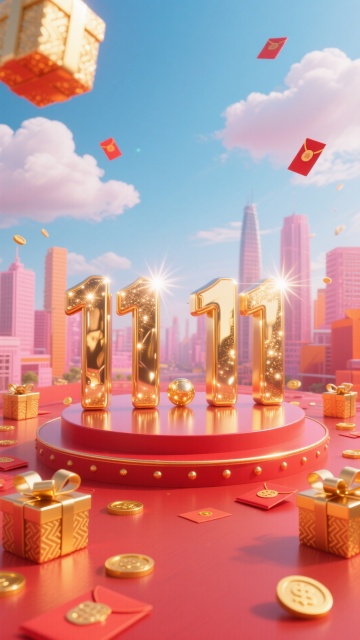 巨大的金色 “11.11” 立体数字立在带有红色装饰的圆形展台上,展台上有字“下单官方立减15% ”周围有金色礼盒,点缀红包、金币等元素,背景天空、云朵,城市建筑群在后方若隐若现,大量红色搭配粉、橙、蓝为主色调,红色地面,促销氛围
