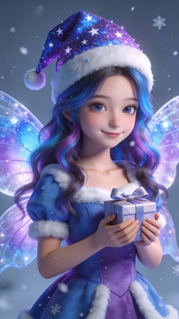 梦幻3D动漫风精灵,星河圣诞帽与玻璃质感翅膀,粒子光效点缀,手持礼盒,营造温馨浪漫的冬日童话氛围。