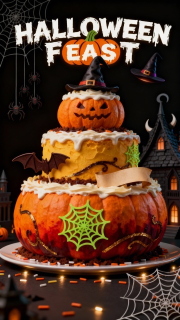 哥特风格与3D风结合,重拟物南瓜蛋糕层层堆叠,霓虹灯风文字点亮“HALLOWEEN FEAST”,营造神秘惊悚又梦幻的万圣节盛宴氛围。