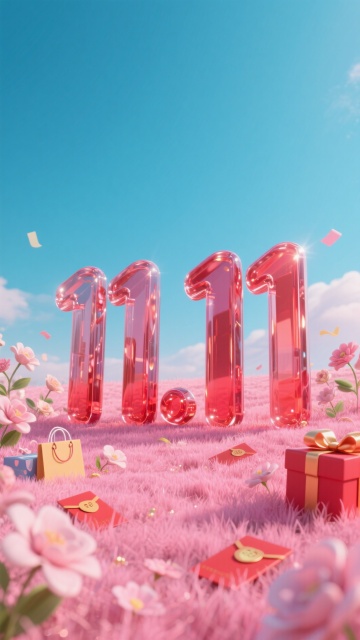 梦幻3D玻璃风“11.11”数字闪耀于粉红毛绒草地,搭配花瓣飘落、红包礼盒,重拟物设计营造甜蜜喜庆氛围。