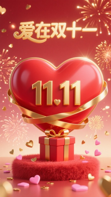 红色渐变背景点缀金色爱心光斑,中央是红色爱心造型立体字 “11.11”,字体边缘有金色描边;上方用金色圆润艺术字 “爱在双十一”,周围环绕心形红金礼盒、缠绕爱心的金色丝带、粉色与金色相间的烟花;底部设红色毛绒质感阶梯展台,台面上散落小爱心金片,风格温馨浪漫