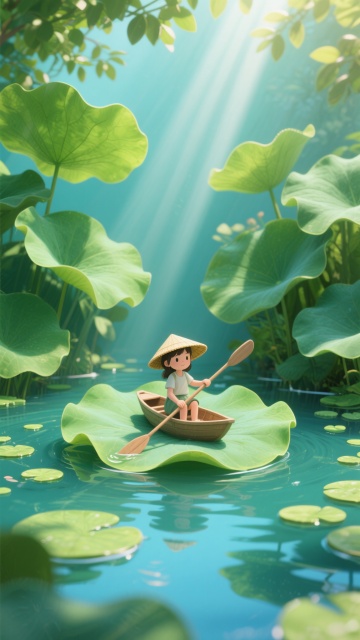 微缩艺术风格插画,小女孩戴着斗笠坐在巨大的荷叶上,手持船桨在荷叶间的水面划行,周围是比人还高大的翠绿荷叶和清澈水面,水面漂浮着小荷叶,阳光从上方树叶缝隙间洒下形成光束,整体色调以蓝绿色为主,营造出人与自然和谐相处的童话感,宁静而梦幻的氛围,平滑的数字绘画质感,柔和的光影效果,细节丰富的植物纹理,人物与环境比例呈现微缩效果。