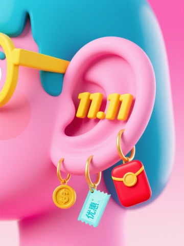 软3D风卡通双手比耶,手持充气感“11.11”票券,糖果色系搭配波普艺术元素,甜蜜可爱,引爆双11狂欢氛围。