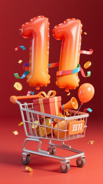 软3D风充气数字“11.11”搭配卡通喇叭、爱心信封与增长图表,红橙渐变背景强化喜庆促销氛围,传递双11大促的可爱与活力感。