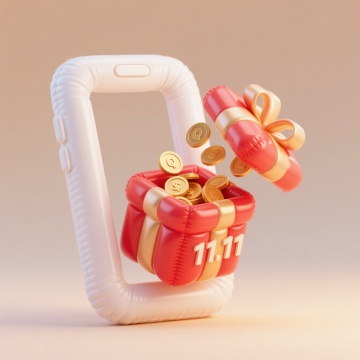 软3D风充气手机框中,红色礼盒弹出金币,11.11字样点缀,喜庆可爱,充满促销氛围。