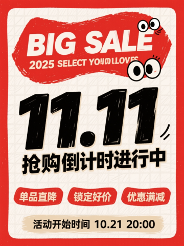 手绘风格。画面:黑色大标题 “11.11” ,小字“抢购倒计时进行中”;上方红色不规则区域有副标题 “BIG SALE”,搭配小字“2025 SELECT YOUR LOVES” ,点缀一对卡通眼睛;“单品直降”、“锁定好价”、“优惠满减”标签,底部小字“活动开始时间 10.21 20:00”。字体:粗体字,黑色、米色、白色为主。背景:红色边框,中间主体区域是米白色带纹理的底。