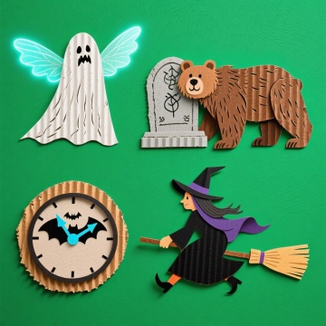可爱卡通风格,拼贴风与描边风结合,拟人化万圣节元素,面料质感十足,梦幻趣味感满满,节日氛围浓厚。