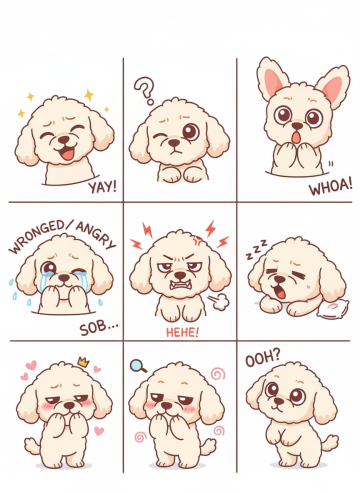 保持狗狗主体不变,狗狗毛发米白色,创作一组表情包,包含表情不同、姿势不同的九宫格表情包,动漫风格