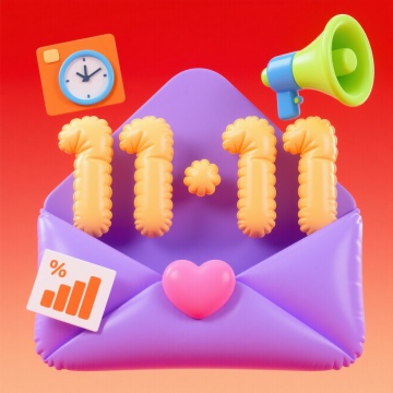 软3D充气风设计,色彩鲜艳的“11.11”数字搭配喇叭、爱心、信封等元素,营造出喜庆、可爱又趣味十足的双十一购物节氛围。