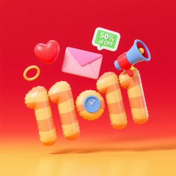 软3D充气风设计,色彩鲜艳的“11.11”数字搭配喇叭、爱心、信封等元素,营造出喜庆、可爱又趣味十足的双十一购物节氛围。