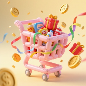 软3D风格购物车,充气质感搭配彩色购物袋与金币,波普艺术色彩碰撞,营造可爱卡通喜庆氛围。
