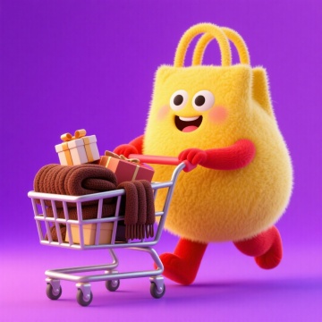 一辆购物车,车内有一个拟人化的红色购物袋(带着开心的表情,有眼睛、嘴巴和红色手臂),购物车里堆满了彩色礼盒;购物车呈现出快速移动的动态感(有速度线等动态效果),黄色背景