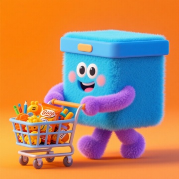 3D风购物车,拟人化商品,塑料质感,可爱卡通风格,节日促销氛围。