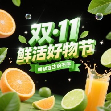 充气膨胀 “11.11” 艺术字,采用半透明充气材质,内部模拟生鲜水珠光泽,数字间隙夹着迷你充气水果(草莓、橙子)与充气蔬菜(生菜、胡萝卜)模型。背景为淡绿色,底部用充气叶子拼接出 “新鲜直送” 标语,右侧放充气购物篮(内装充气生鲜),整体清新有活力,突出超市生鲜双 11 新鲜与优惠