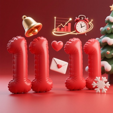 红充气数字 “1111”,搭配铃铛、图表、闹钟等元素,洋溢圣诞双 11 氛围