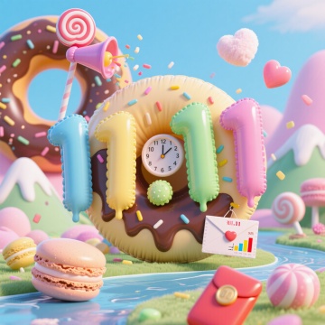 软3D充气风格,色彩鲜艳的“11.11”数字搭配喇叭、时钟、爱心等元素,波普艺术感十足,营造出充满趣味与喜庆的促销氛围。