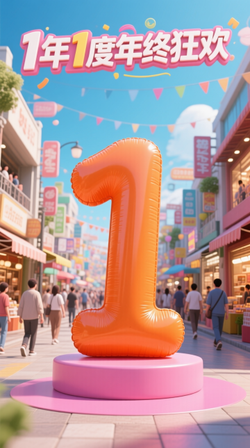 软3D风格的充气数字“1”置于热闹街景中央,搭配卡通化彩旗与活泼字体,营造出喜庆、促销氛围,传递双11年度狂欢的节日感。