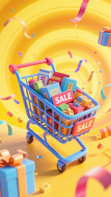 一个购物车,车内有一个拟人化的蓝色优惠券(有嘴巴和红色手臂写,写着“SALE”),购物车里堆满了彩色礼盒;购物车呈现出快速移动的动态感(有速度线等动态效果),黄色背景