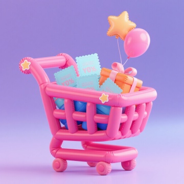 软3D风格购物车,充气感设计,搭配波普艺术色系,满载糖果色礼盒与气球,萌趣可爱,甜蜜氛围拉满,适合双11节日促销场景。