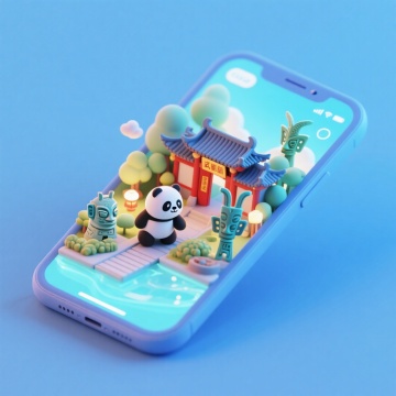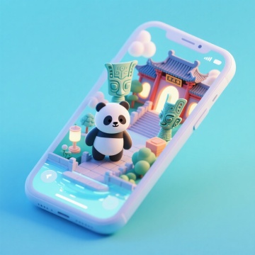 软3D风格的微缩艺术场景,熊猫与传统建筑在手机屏幕上梦幻呈现,融合科技感与卡通感,清新柔和,充满可爱气息。