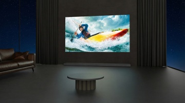 一台现代超薄液晶电视,屏幕上显示着高清写实风格的雪山风景,画面中巍峨的雪山峰顶覆盖着洁白的积雪,山体呈现出灰黑色的岩石纹理,山脚下是金黄色的植被和蜿蜒的河流,河流中点缀着大小不一的黑色岩石,天空是清澈的淡蓝色,整体色彩鲜明,光影层次丰富,电视的银色金属支架支撑着屏幕,展现出简约而现代的设计感。