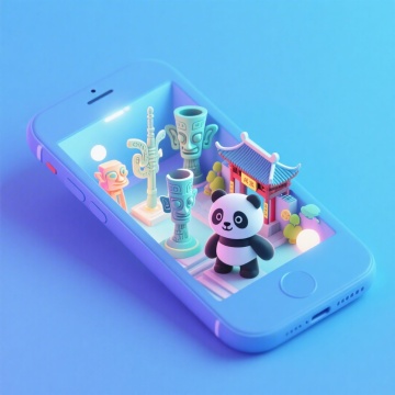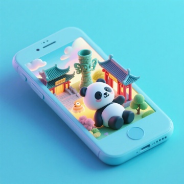 软3D风微缩艺术,熊猫与中式古建筑萌趣融合,科技感手机屏中展现梦幻民族风情。