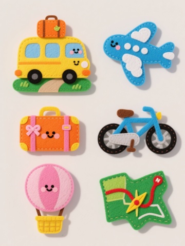 六个不同旅行主题的毛毡材质卡通元素集合,每个元素都有圆润的造型和可爱的表情,色彩鲜艳明快,主色调为黄色、蓝色、橙色和绿色,元素之间留有适当空白,整体呈规整排布。第一个元素是黄色旅行巴士,车顶上放着橙色行李箱,旁边有绿色的草地和小路;第二个元素是蓝色的飞机,机翼上有白色的云朵图案;第三个元素是橙色的行李箱,上面系着粉色的蝴蝶结;第四个元素是蓝色的自行车,车轮是黑色的,车座是棕色的;第五个元素是粉色的热气球,下面有一个黄色的篮子;第六个元素是绿色的地图,上面有红色的路线标记和黄色的指南针。所有元素都具有柔软的毛毡质感,边缘有明显的缝线,光影柔和,高光部分呈圆形,阴影自然过渡。