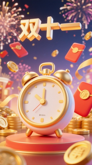 软3D风融合国潮元素,鎏金质感闹钟与红包金币飞舞,烟花绽放,营造喜庆热烈的双十一氛围。