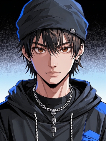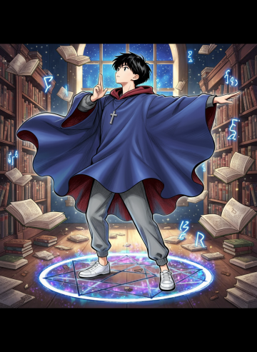 神秘夜景中,动漫风少年与白猫相伴,超现实主义的纸卷环绕,营造出梦幻氛围。