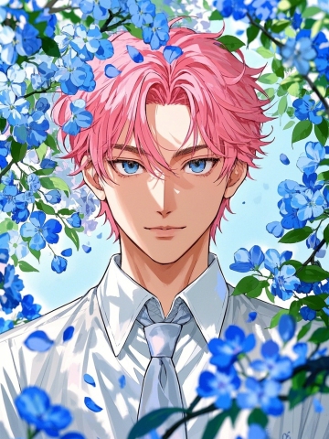 一个帅气的少年,粉发碧眼,帅气阳光,白色衬衫,打领带,型男发型,白皙的皮肤,面部特写,树影斑驳,蓝色花瓣飘落,背景是花海